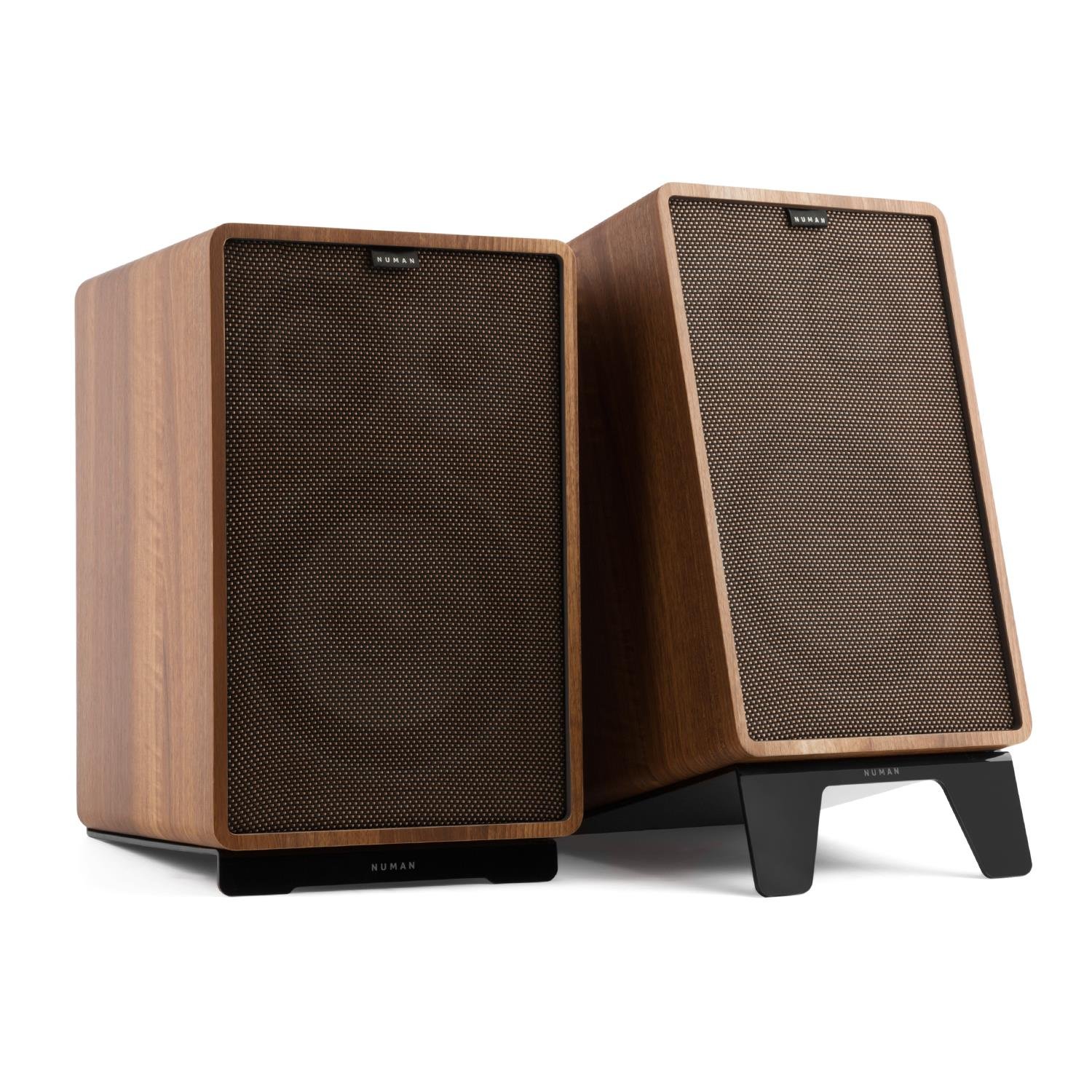 NUMAN RETROSPECTIVE 1978 MKII - Haut-parleurs d'étagère à 3 Voies, 2 x 100W, Subwoofer 20cm (8"), Haut-Parleur de 10cm (4"), Tweeter, Design rétro, Cache Brun foncé, Support Noir, Noyer